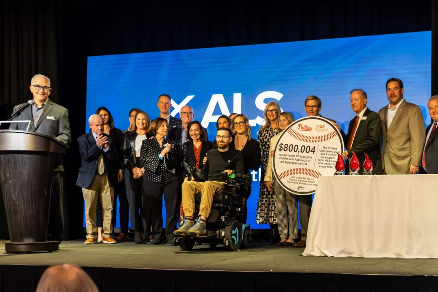 The Philadelphia Phillies spoke of their involvement in the ALS community and presented ALS United Mid-Atlantic with a check of $800,004 for ALS research, care, and support for those living with ALS and their families. The $4 being symbolic of first basemen Lou Gerhig’s baseball number. John Weber, Senior Vice President, Ticket Operations for the Philadelphia Phillies, was honored with a gift from ALS United Mid-Atlantic for all he has done for families in the ALS community. Board Chair Emeritus Ellyn Phillips personally thanked John Weber, and the Philadelphia Phillies Organization, for being incredible partners for over 40 years.